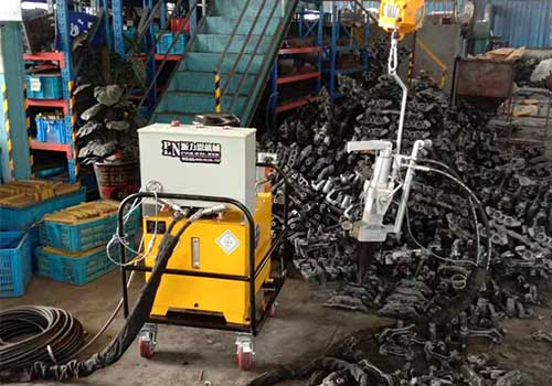 鑄件澆冒(mao)口分離(li)器(qi)工作原(yuan)理:工藝流程是(shi):油(you)泵站(zhan)接380伏電源,油泵站(zhan)和分離(li)器通(tong)過(guo)2根高壓(ya)油管(guan)(一(yi)進一(yi)出)連接,分離(li)器(qi)(qi)由(you)平衡葫蘆吊(diao)懸掛方(fang)便操作(zuo)。以下是(shi)工作(zuo)原理。鑄件澆冒口分離(li)器(qi)(qi)通過液壓(ya)泵站產生18-70MPa液(ye)壓動力(li)。開(kai)機(ji)時,按下(xia)鑄件分離(li)器手把(ba)開(kai)關,油(you)泵(beng)站由低壓泵(beng)送油(you),當壓力(li)達到(dao)18MPa,高低(di)壓切換閥切斷低(di)壓泵(beng),這時,由(you)高壓柱塞泵(beng)工作送油,高壓柱塞泵(beng)產生(sheng)大70Mpa工作壓(ya)力(高(gao)低(di)壓(ya)切換原理就是(shi)低(di)壓(ya)泵(beng)快速送大(da)量的(de)油(you)(you)(you)(you),而高(gao)壓(ya)柱塞泵(beng)是(shi)少(shao)量油(you)(you)(you)(you)產(chan)生高(gao)壓(ya),大(da)程(cheng)度防止(zhi)大(da)量油(you)(you)(you)(you)進出,防止(zhi)油(you)(you)(you)(you)泵(beng)站升(sheng)溫),油(you)(you)(you)(you)管內(nei)高(gao)壓(ya)油(you)(you)(you)(you)推動分(fen)離(li)(li)器油(you)(you)(you)(you)缸(gang)內(nei)活塞,活塞推動前端尖(jian)鐵(tie),尖(jian)鐵(tie)向兩邊(bian)推動楔鐵(tie),以(yi)上油(you)(you)(you)(you)壓(ya)一系列動作產(chan)生大(da)噸分(fen)離(li)(li)張力,將(jiang)鑄件澆冒口分(fen)離(li)(li)器從母體分(fen)離(li)(li)下來。